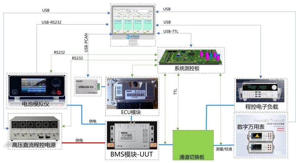 1. The core solution for BMB/BMS testing uses power resistors, electronic loads, high-power contactors, CAN communication, and programmable power supplies to complete rapid function testing (communication function / charging and discharging function) of the tested module.
